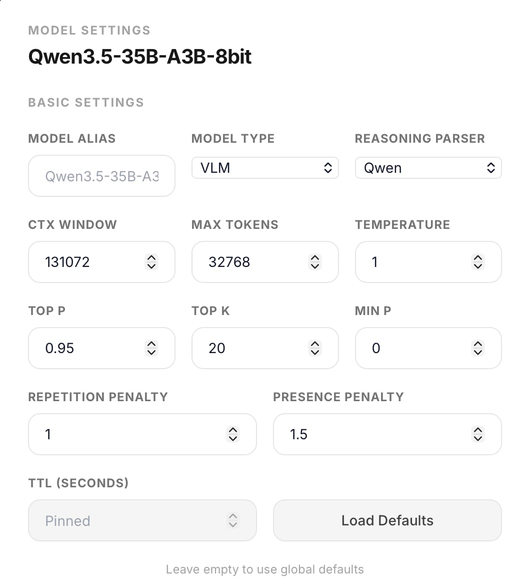 Now if you go to Settings -> Models you should be able to see all of your models from oMLX. I suggest you click hide on all of them except the main model (in my case it’s Qwen3.5-35B-A3B-8bit).