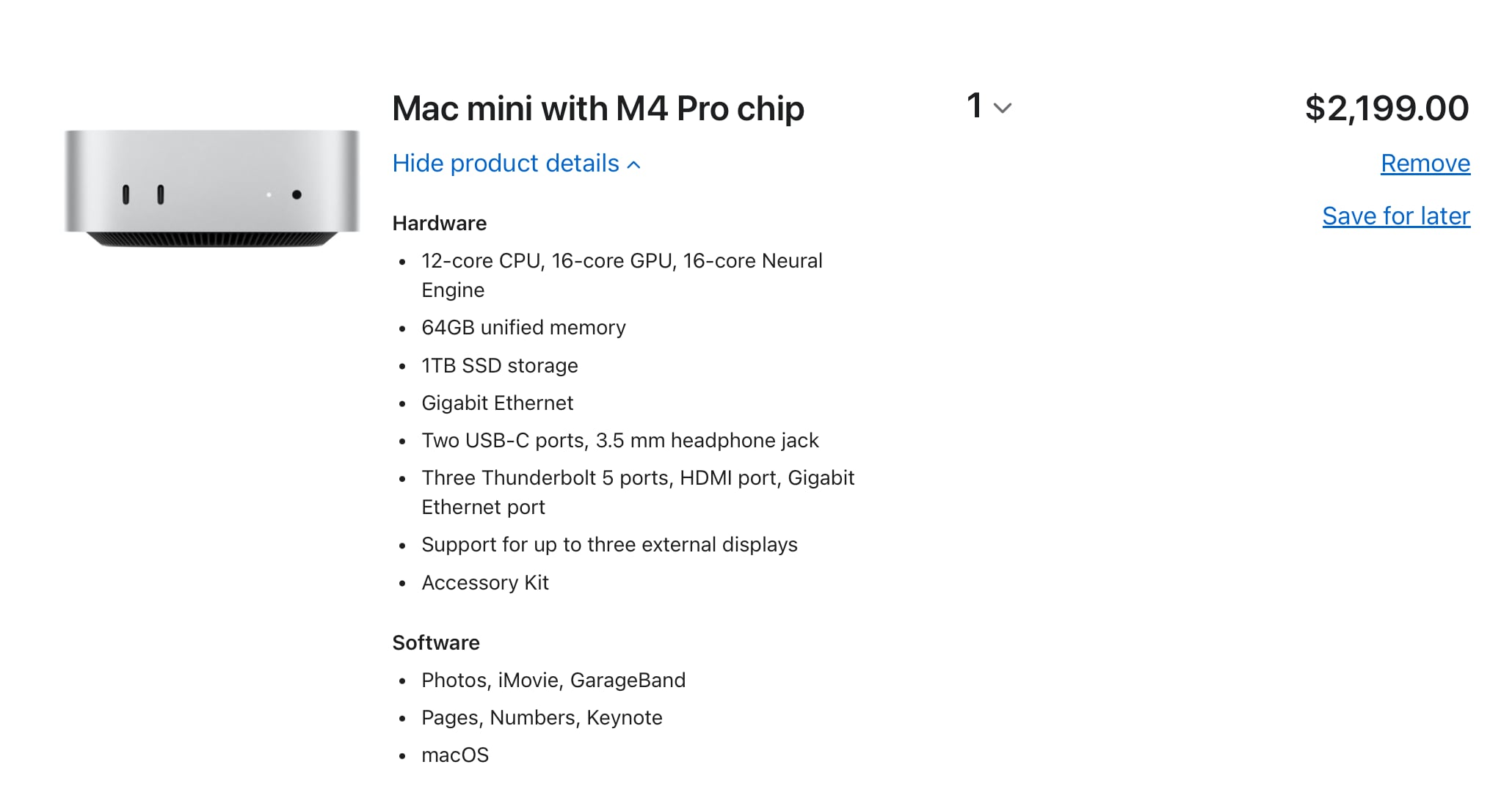 | Mac mini | M4 Pro (12 CPU / 16 GPU) | 64 GB (up to 273 GB/s) | $2,199.00 |