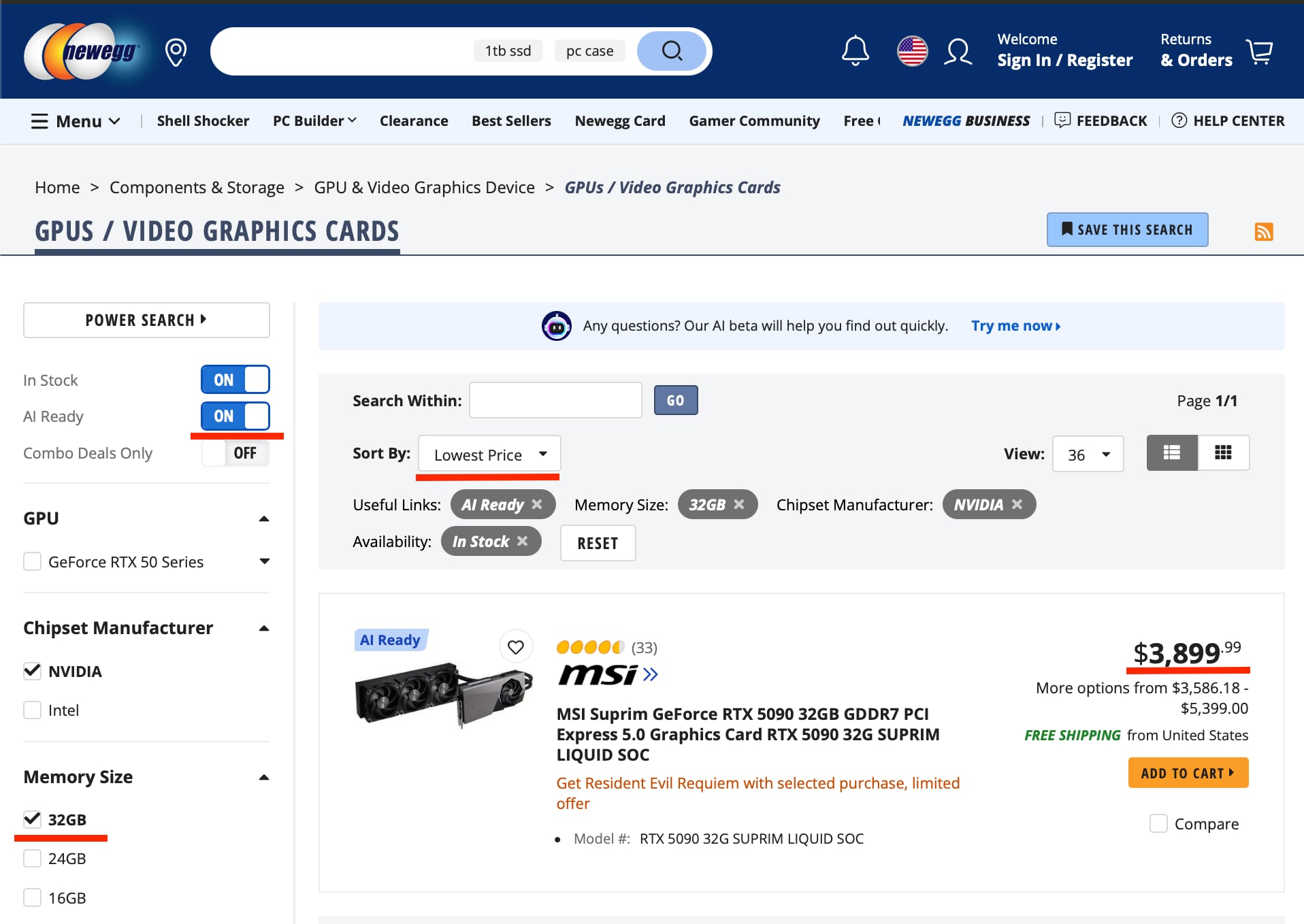 Building a traditional PC with a discrete GPU is not really an option here. GPUs with 32 GB of VRAM and above are quite hard to come buy these days. For example, prices for Nvidia 5090 32GB now start around $3,900 (Newegg, 5th of April 2026). Note the search results returned only a single card in stock.