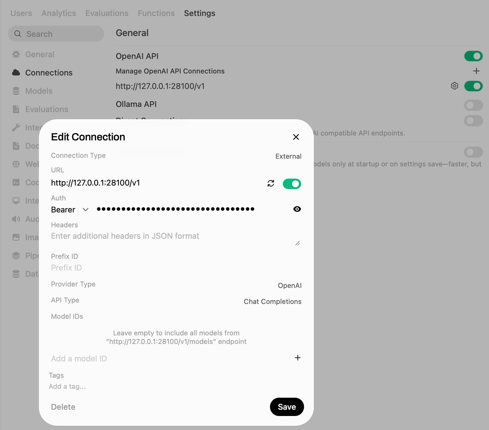 Go to Settings -> Connections and add a local Open AI endpoint (in this context Open AI is just a schema standard):