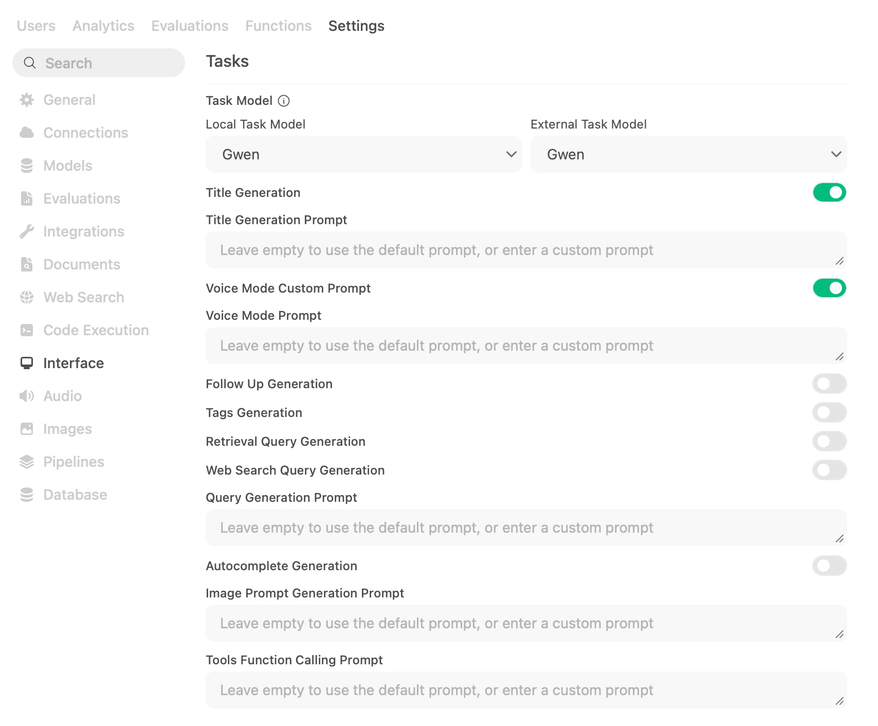 As the final thing to configure, I would recommend to visit Settings -> Interface. Here you can select your task model (in my case my main model is my task model) and you can select or remove certain background tasks your task model would be used for. Like the chat title generation, tags generation, follow ups, etc.