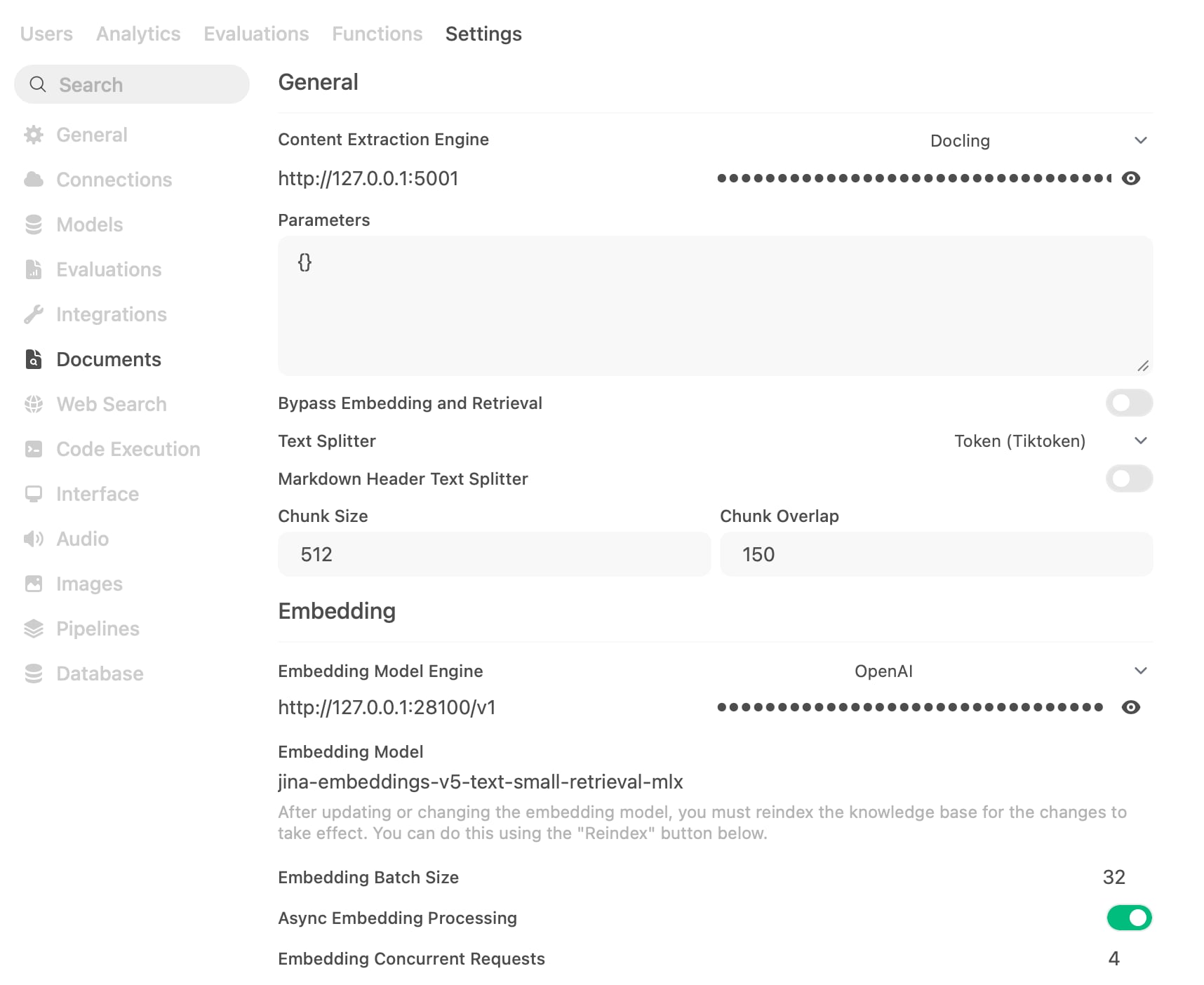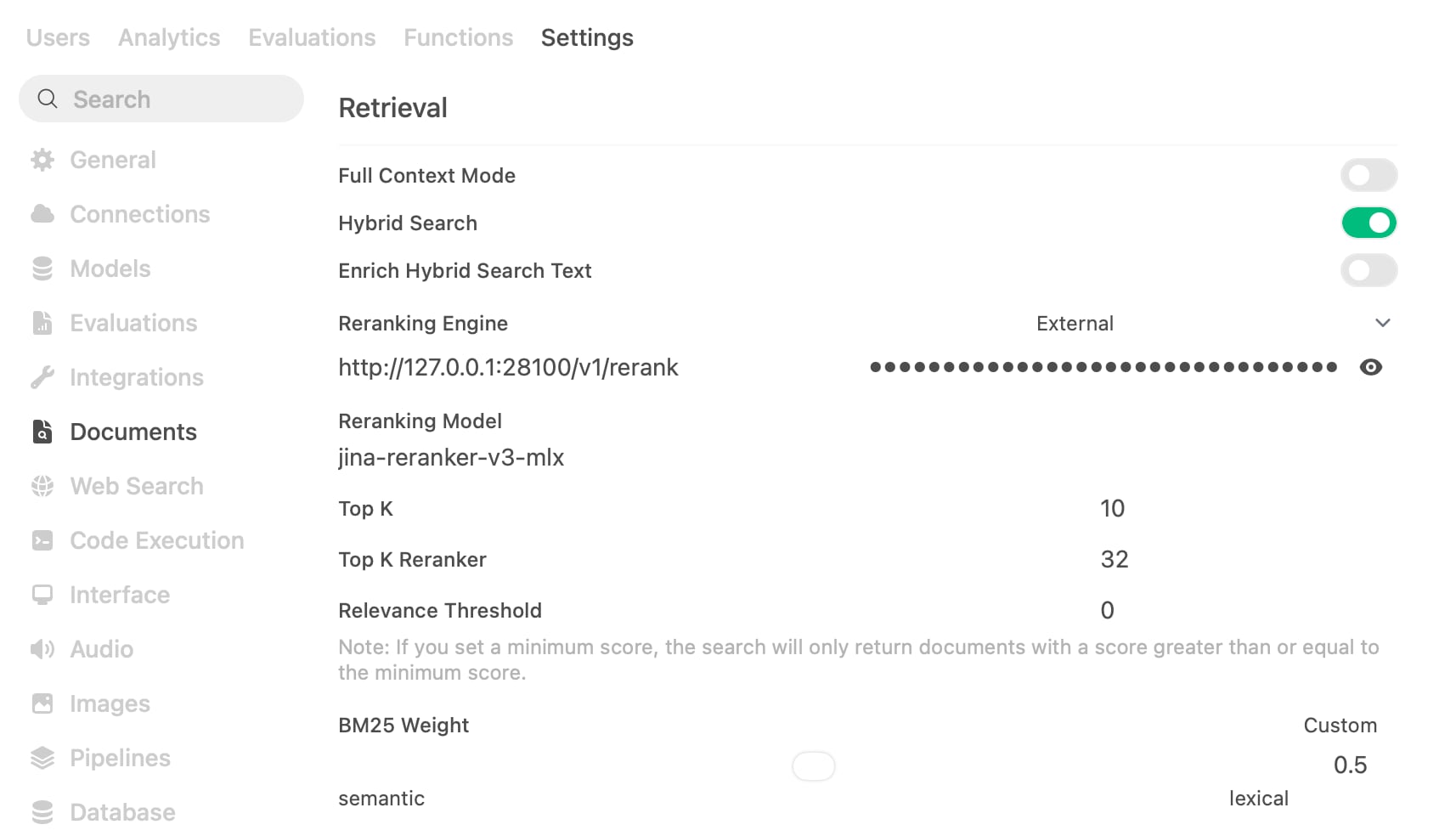 Note: I’m setting the Relevance Threshold to 0. Perhaps I did something wrong, but with any value above 0 uploading a single document to a chat didn’t work for me. The model could not retrieve the content from it at all, getting empty results. So, I kept it set to 0.