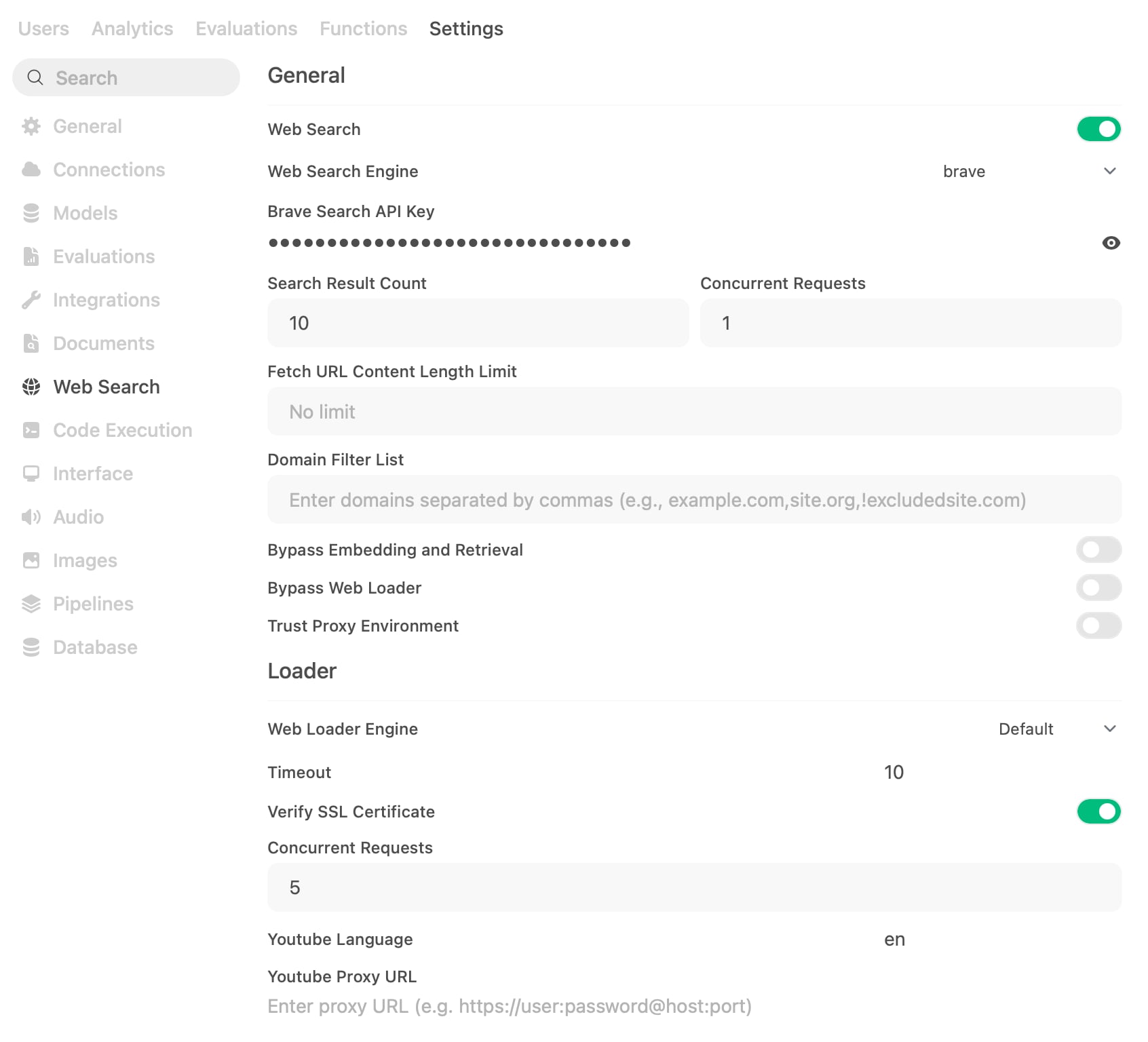 Now go to Settings -> Web Search, select your provider (e.g. Brave) and put the API key in.
